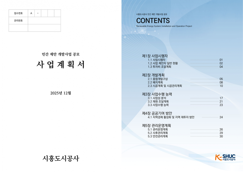 기술용역제안서 태양광사업 지자체 응모사업계획서 제작 페이지 정보 작성자 최고관리자 댓글 0건 조회 42회 작성일 25-12-15 16:03 목록 답변 본문 · 구성내용 : 태양광사업 지자체 응모사업계획서 제작 · 수행범위 : 기획 및 디자인 태양광, 태양열, 사업계획서 이전글2026년 성남시 CCTV유지보수용역 제안서 25.12.16 다음글태양광 발전설비 점검정비 기술제안서 제작 25.12.15 댓글 0 댓글목록 등록된 댓글이 없습니다.