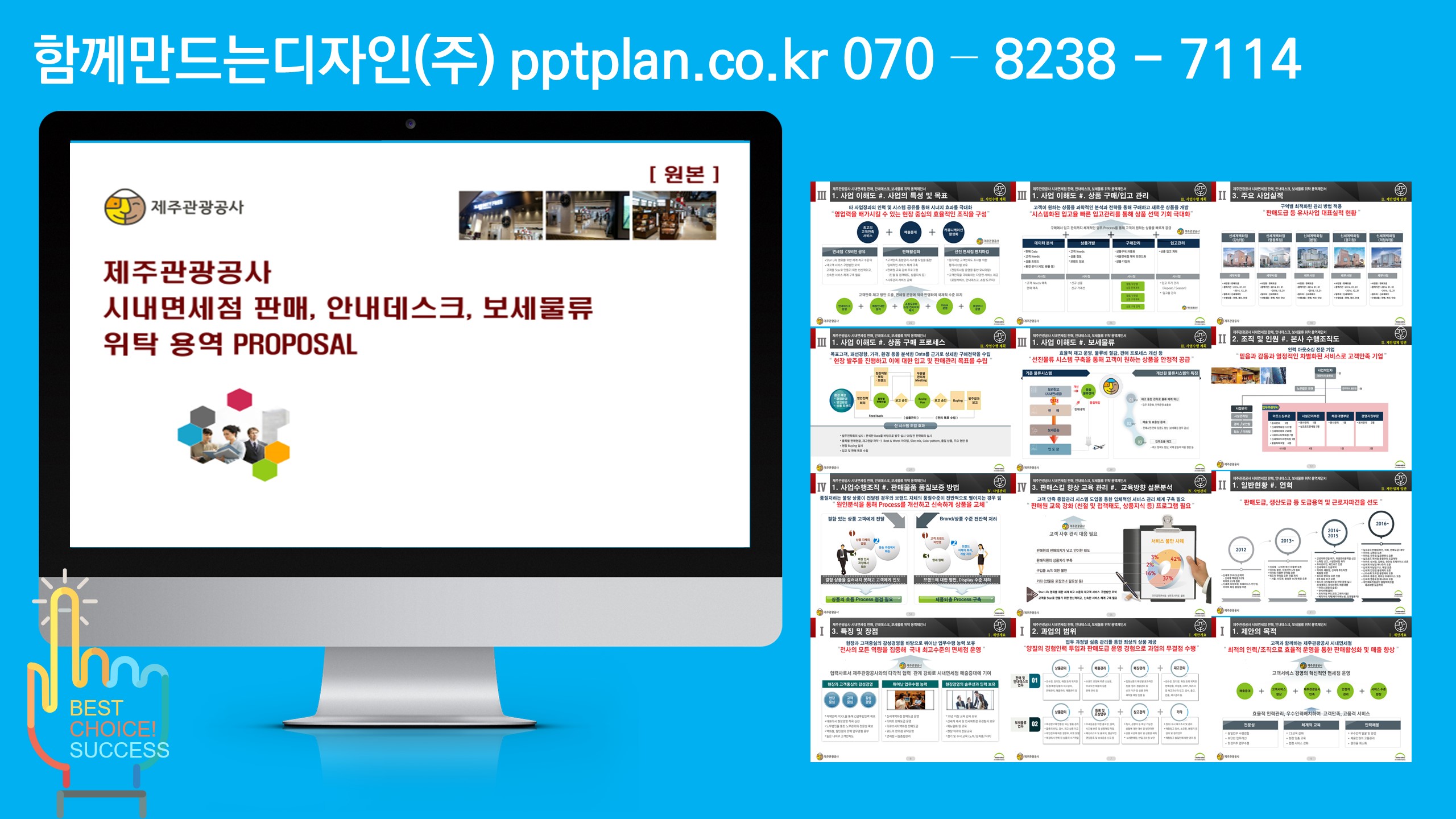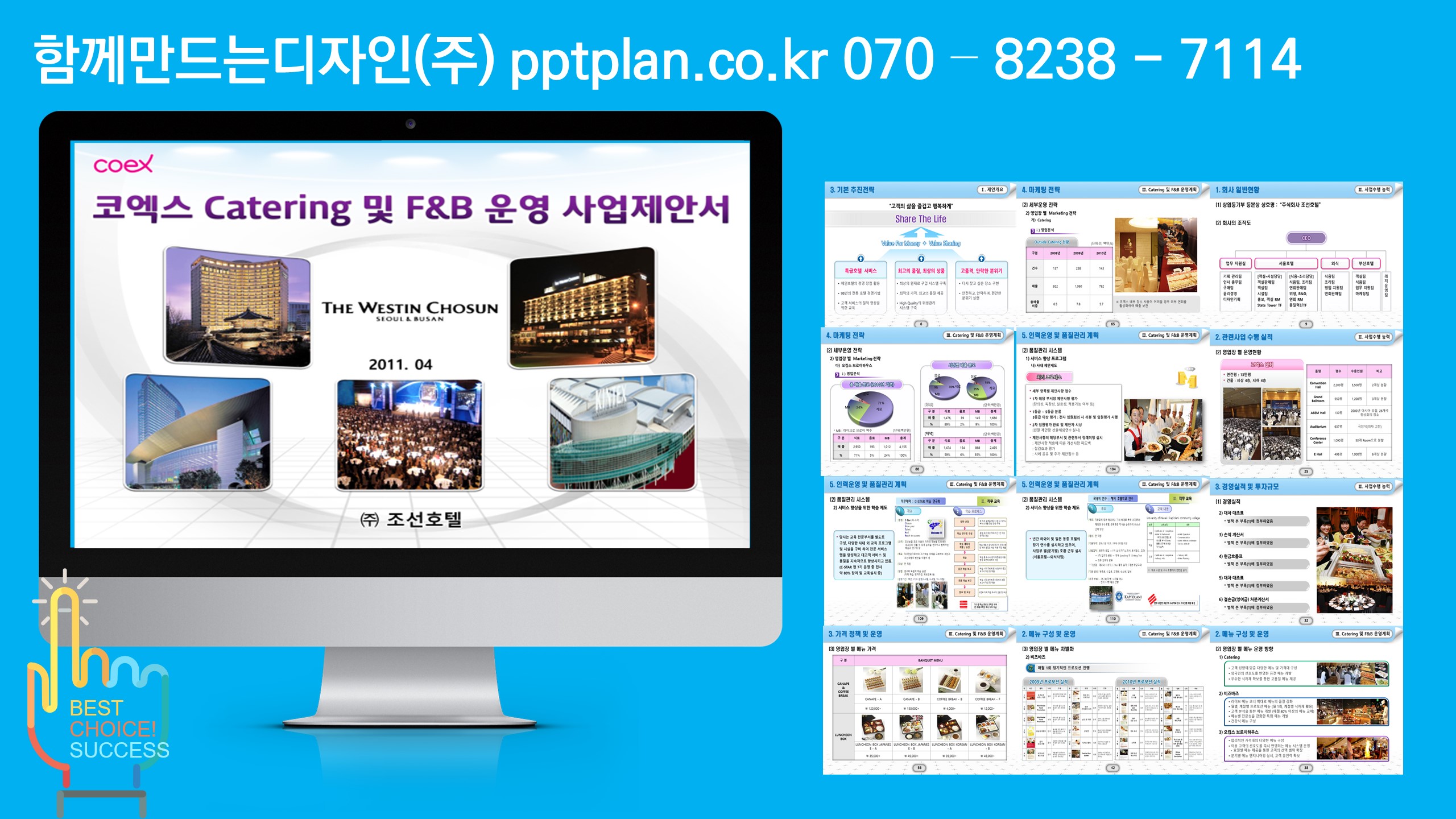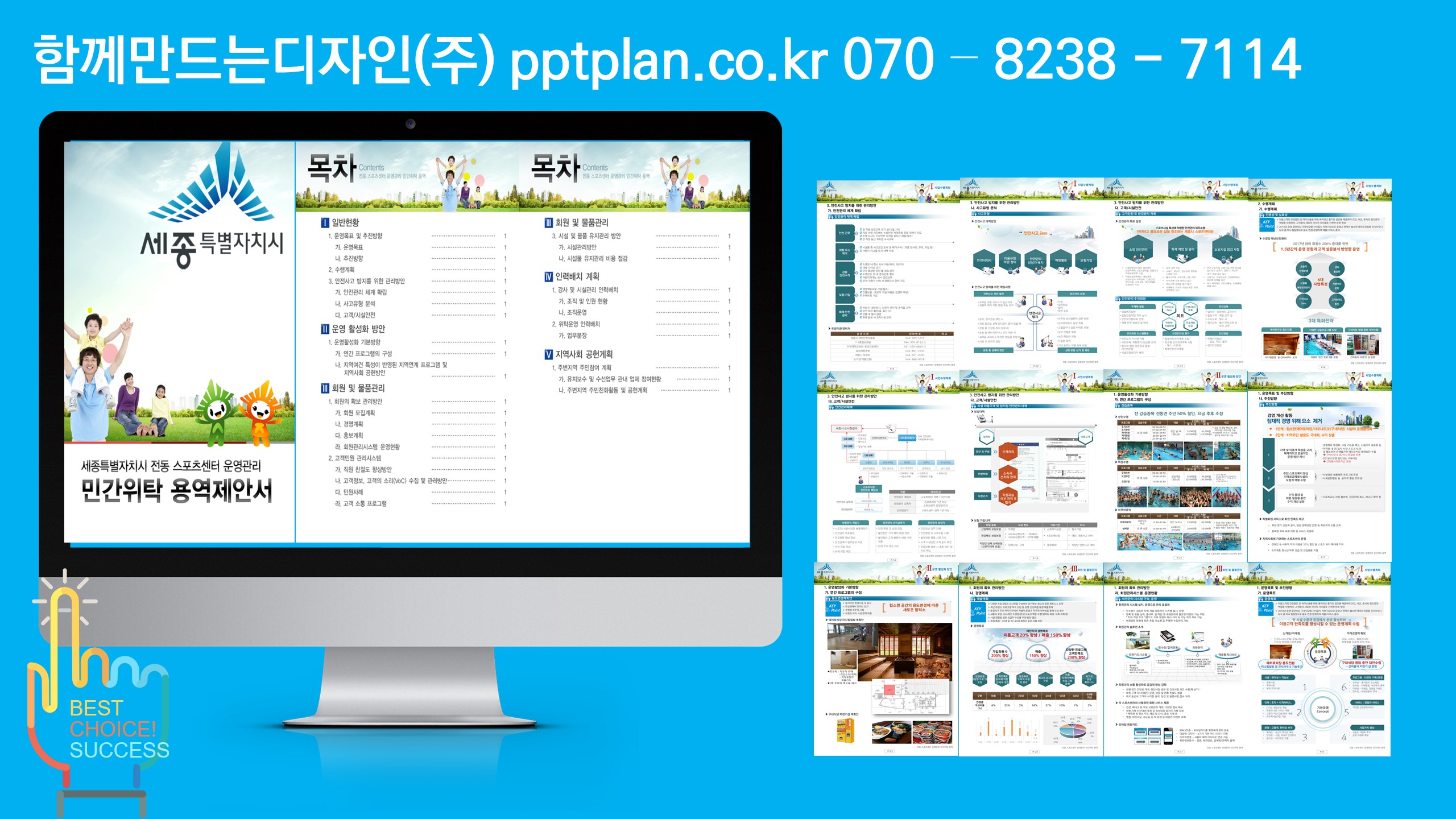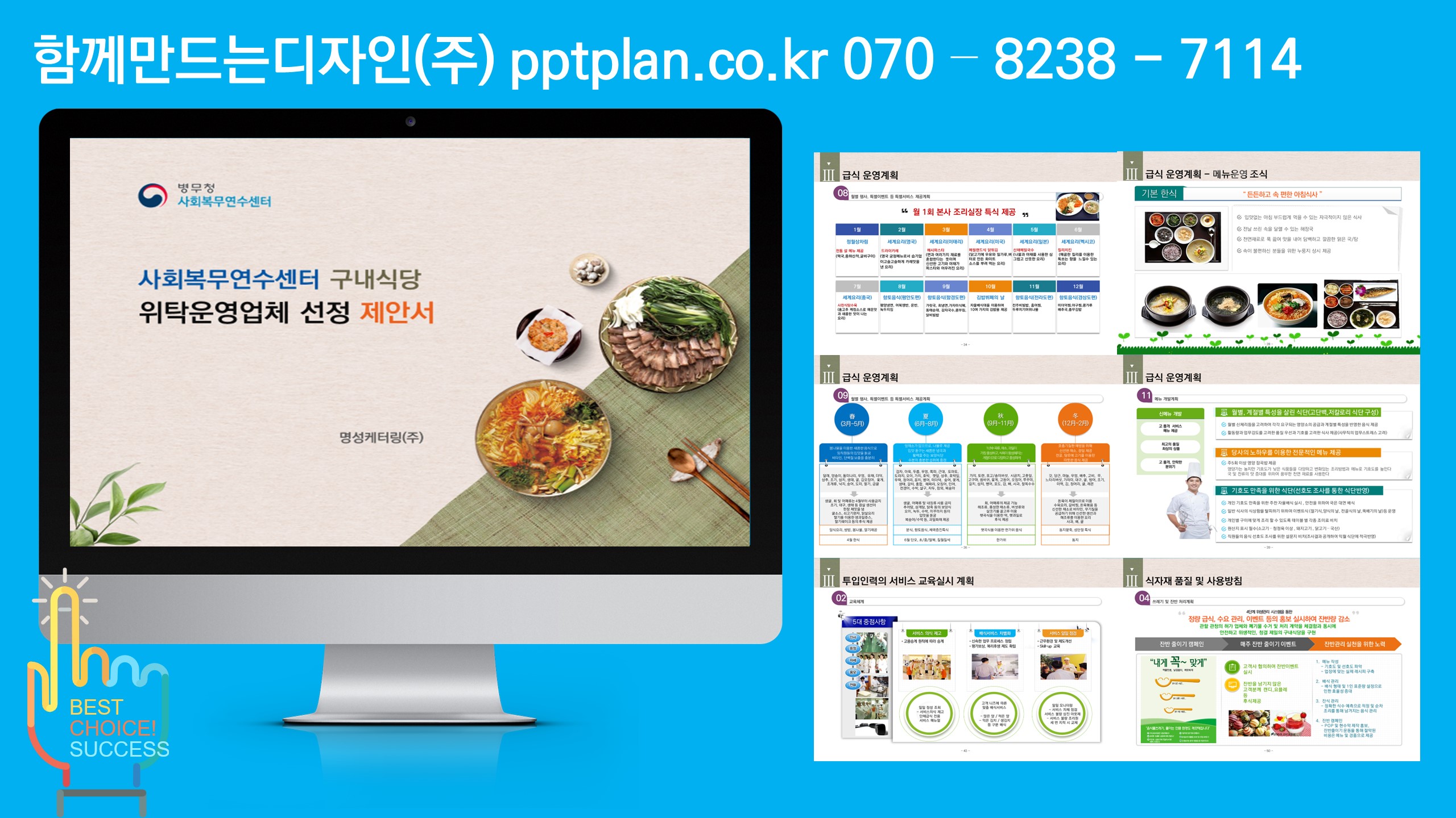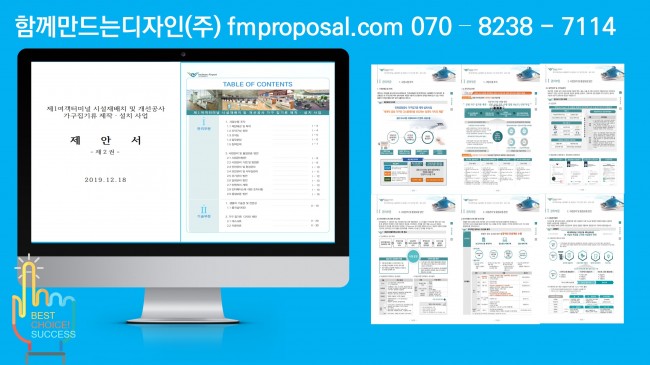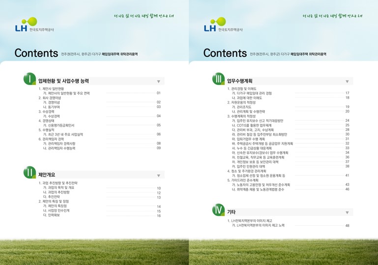 제주관광공사 시내면세점 판매위탁 용역, 파주시 외 스토츠센터 위탁운영제안서, 울산 북구 통합관제센터 모니터링, 울주군 방법관제센터, 방과후 학교교육 기습제안서, 장애인 복지관 위탁운영제안서, 서울시청/한국산업인력공단/인터넷진흥원 이전 기술제안서, 우정청우편물운송위탁용역 기술제안서 제작, 음식물류폐기물 전용수거용기 세척 용역 양천구청, 중국지역 비자신청센터 운영기관 사업제안서, 고객센터 위탁운명제안서, 건강보험공단고객센터위탁운영, 행정안전부고객센터위탁운영, 서울시 다산콜센터 위탁운영, KT/한국전력 컨텍센터위탁운영, 자전거대여점 위탁운영제안서, 입점제안서, 웨딩혹 위탁운영제안서, 외국어고 기숙사 위탁운영제안서, 캠핑장위탁운영제안서, 한류콘텐츠 제안서, 공연시설 위탁운영제안서, 검침업무위탁운영제안서, 물품납품제안서, 체육시설 위탁운영제안서, 복사실 및 발간심 위탁운영제안서, KOICA ODA/YP KOICA 연수사업쟁정지원 기술제안서, 우정청 우편물 물류운송 기술제안서, 청사이전/기업이전 기술제안서, 장애인시설 위탁운영제안서, 근로자파견 제안서, 단체급식 입찰제안서, 중앙보훈병원, KIRX단체급식제안서, 철도기술연구원, 러시아 현대자동차, 카자흐스탄 케터링, 수력원자력, 케이터링, 조선호텔/코엑스, 인천어린이급식위탁제안서, 영암전남도청단체급식제안서, 엘리시안 파르나스호텔 단체급식 제안서, 한전아트센터케이터링제안서, 서울교통공사 단체급식 제안서, 피로연케이터링제안서, 한국거래소단체급식(인천아시안게임, 세종충남대학교병원 급식제안, 국방부 사회복무연수센터, 오송케이터링 등 다수