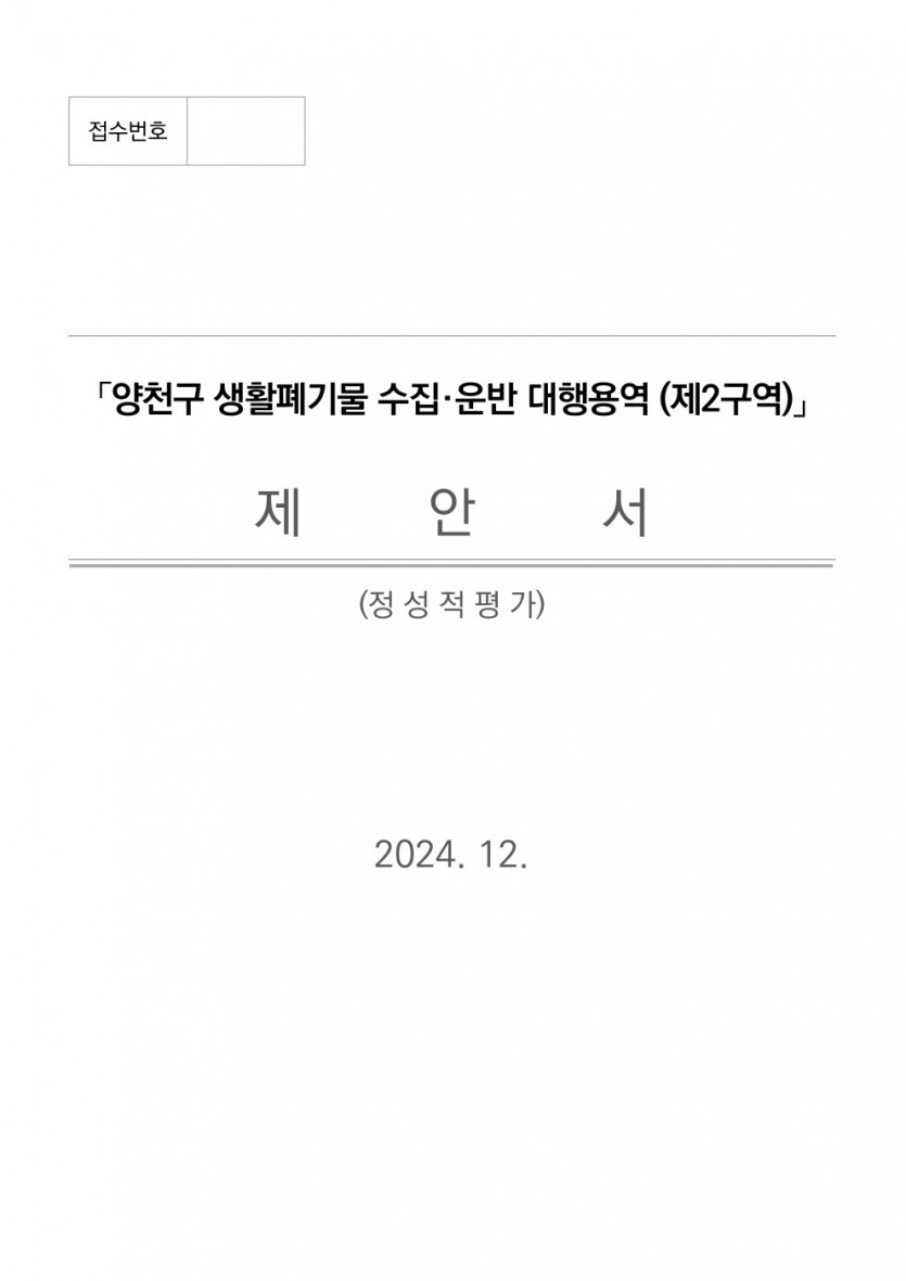 위탁운영제안서 서울시 양천구 생활폐기물 수집운반 제안서 제작(정성평가 전체 통합 1등) 페이지 정보 작성자 최고관리자 댓글 0건 조회 126회 작성일 24-12-11 16:06 목록 답변 본문 · 구성내용 : 서울시 양천구 생활폐기물 수집운반 제안서 제작 · 수행범위 : 원고기획 및 디자인 생활폐기물 이전글오피스사옥 자산관리제안서 제작 24.12.19 다음글수도검침용역제안서 제작 24.12.11 댓글 0 댓글목록 등록된 댓글이 없습니다.