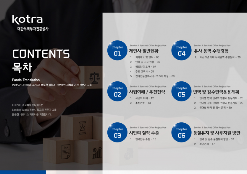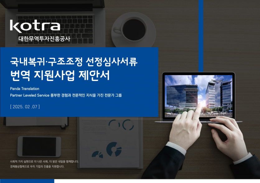 기술용역제안서 국내복귀·구조조정 선정심사서류 번역 지원사업 제안서 페이지 정보 작성자 최고관리자 댓글 0건 조회 130회 작성일 25-02-07 11:16 목록 답변 본문 · 구성내용 : 국내복귀·구조조정 선정심사서류 번역 지원사업 제안서 · 수행범위 : 기획 및 디자인 번역, 번역제안서, 코트라, kotra 이전글한국데이터산업진흥원 원가계산 용역 제안서 제작 25.03.18 다음글경남대학교 사무기기 유지보수제안서 25.01.23 댓글 0 댓글목록 등록된 댓글이 없습니다.