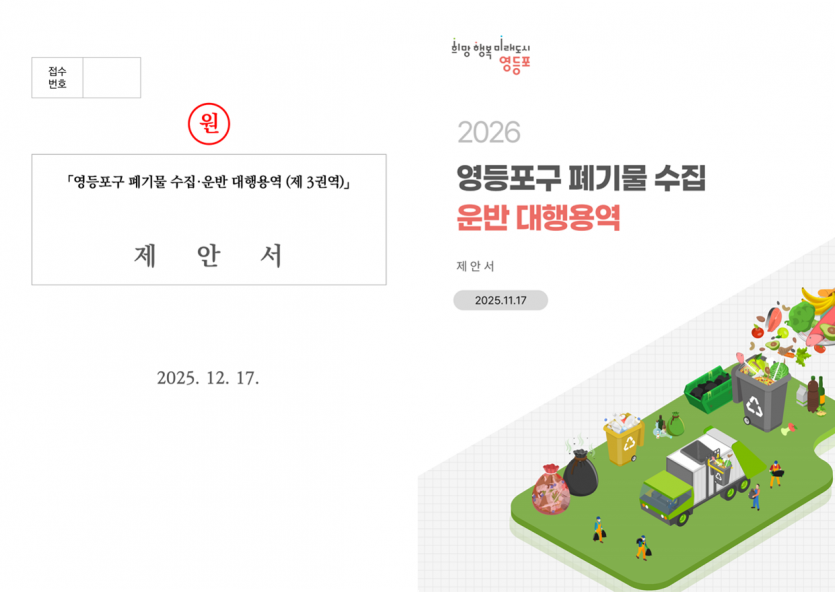 위탁운영제안서 영등포구 폐기물 수집운반 대행용역 제안서 제작 페이지 정보 작성자 최고관리자 댓글 0건 조회 29회 작성일 25-10-24 14:38 목록 답변 본문 · 구성내용 : 영등포구 폐기물 수집운반 대행용역 제안서 제작 · 수행범위 : 기획 및 디자인 폐기물, 생활폐기물, 재활용, 가로정비, 가로청소 이전글제주특별자치도교육청 테크센터 운영 용역 25.11.28 다음글2026년정보화기기 운영 용역 25.10.17 댓글 0 댓글목록 등록된 댓글이 없습니다.